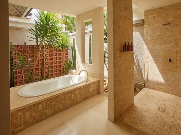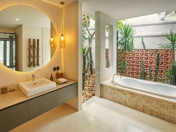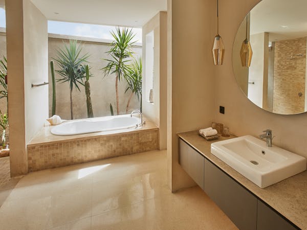 Our stylish 1 bedroom villas, feature private pools, tropical garden surrounds and with fully fitted open-plan kitchens with adjoining lounge and dining areas. Bathrooms are open concept featuring large, deep baths and spacious showers in lush garden settings. These villas come with large flat-screen TVs, entertainment systems, and complimentary Wi-Fi. At Ahimsa Beach, a selection of breakfasts is served daily in the comfort of your villa. Guests are encouraged to soak up the sun or just relax on the resort's sun lounges on Jimbaran beach.